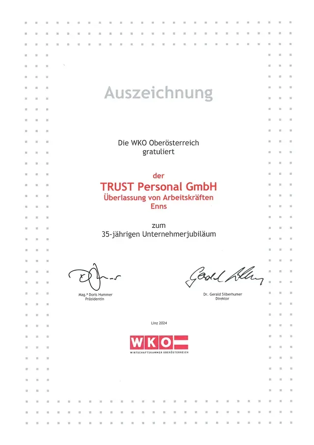 Der Personalbereitsteller TRUST Personal GmbH feierte 2017 sein 30 jähriges Firmenjubiläum. Gegründet 1987 als TRUST Steiner GmbH arbeitet die in Enns ansässige Firma TRUST Personal GmbH auf den Gebieten Personalbereitstellung und Industriemontagen in den Bereichen Facharbeiter und Techniker.